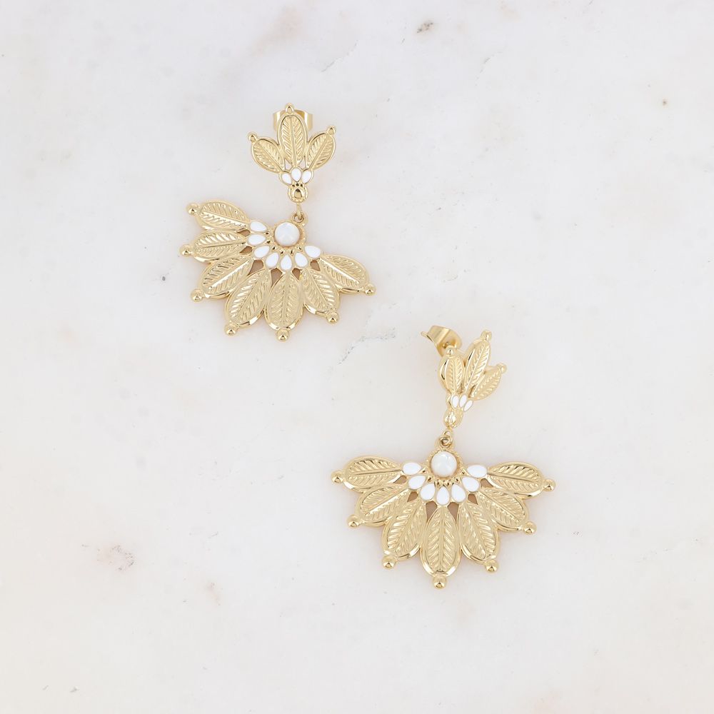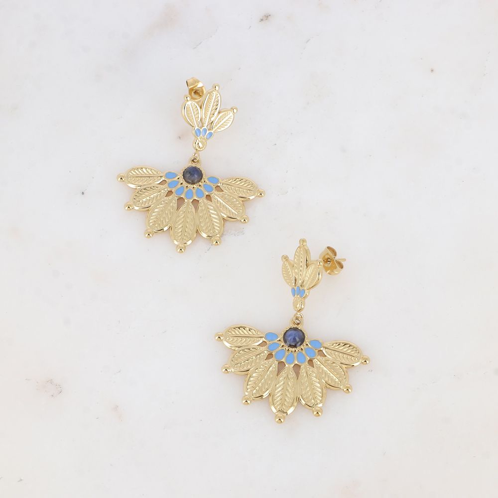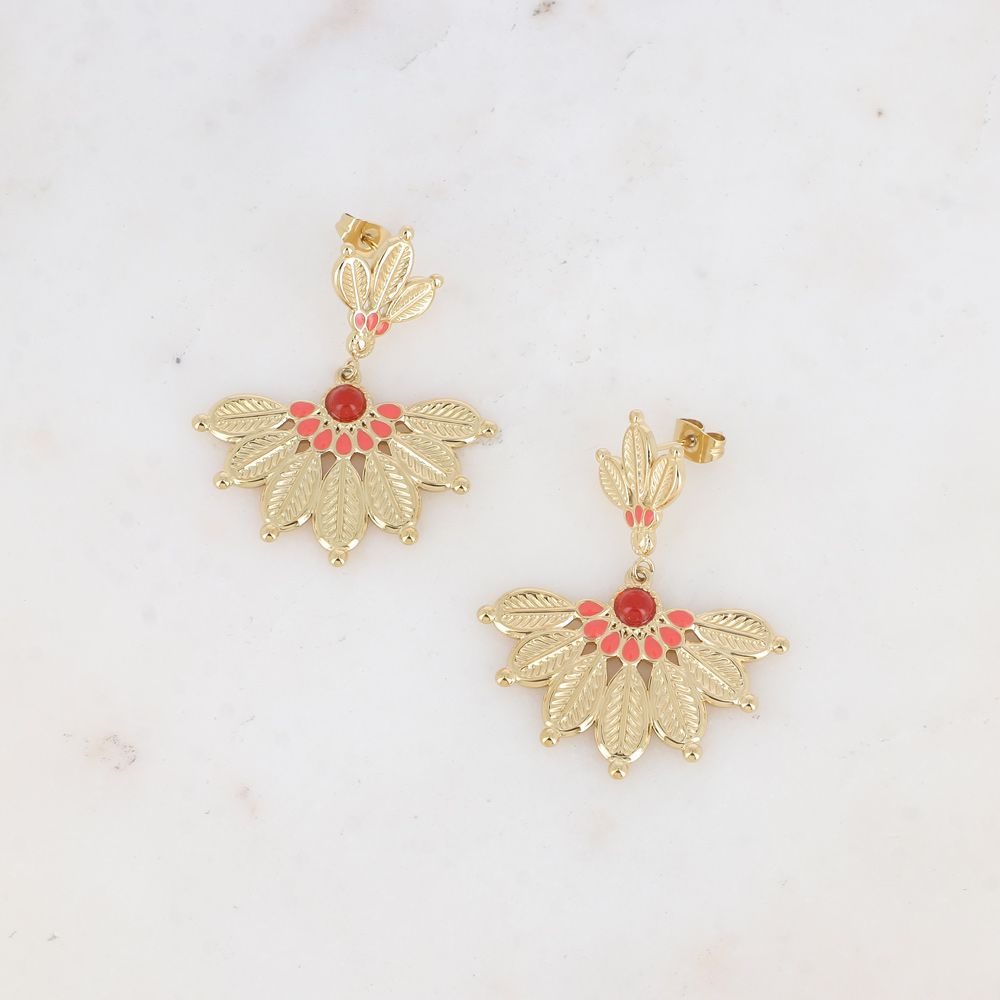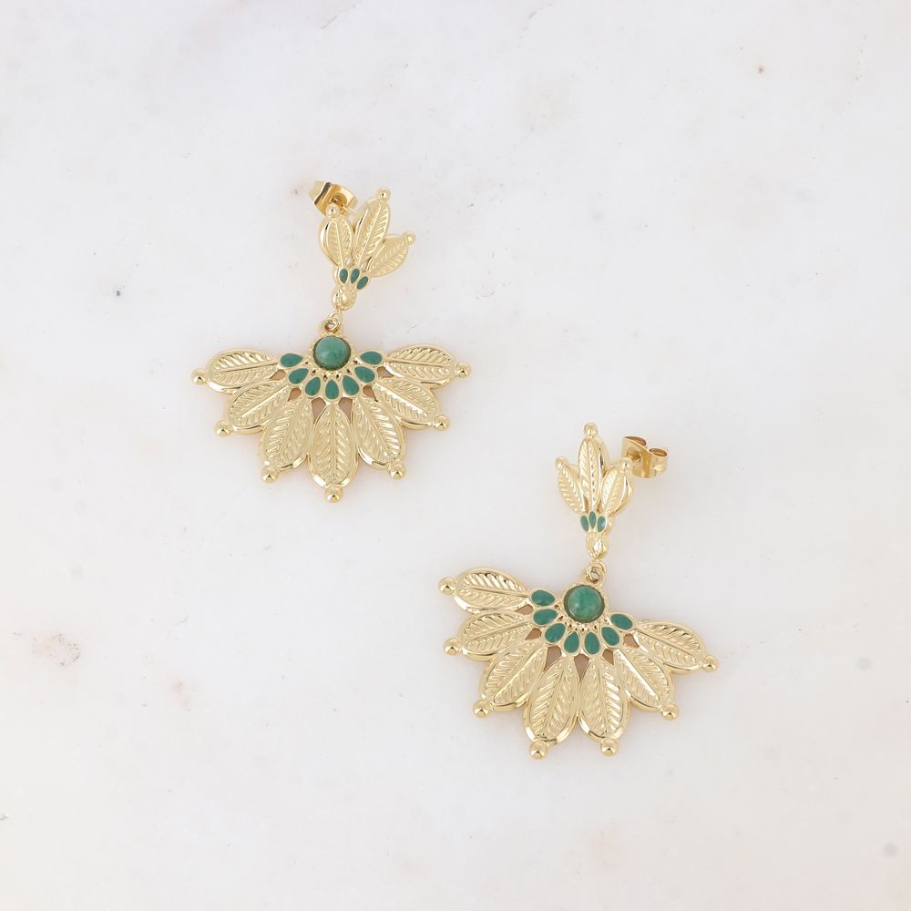 Boucles d'oreilles pendantes en acier inoxydable composées de deux empiècements enmotif ethnique floral gravé, embelli par des touches en émail coloré et par une pierre naturelle ronde.