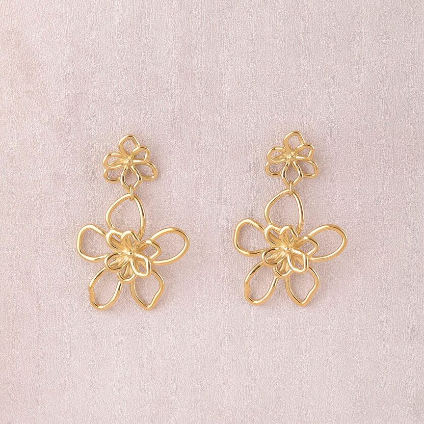 Boucles d'oreilles pendantes en acier inoxydable composées de deux pièces en forme de fleur ajourée.