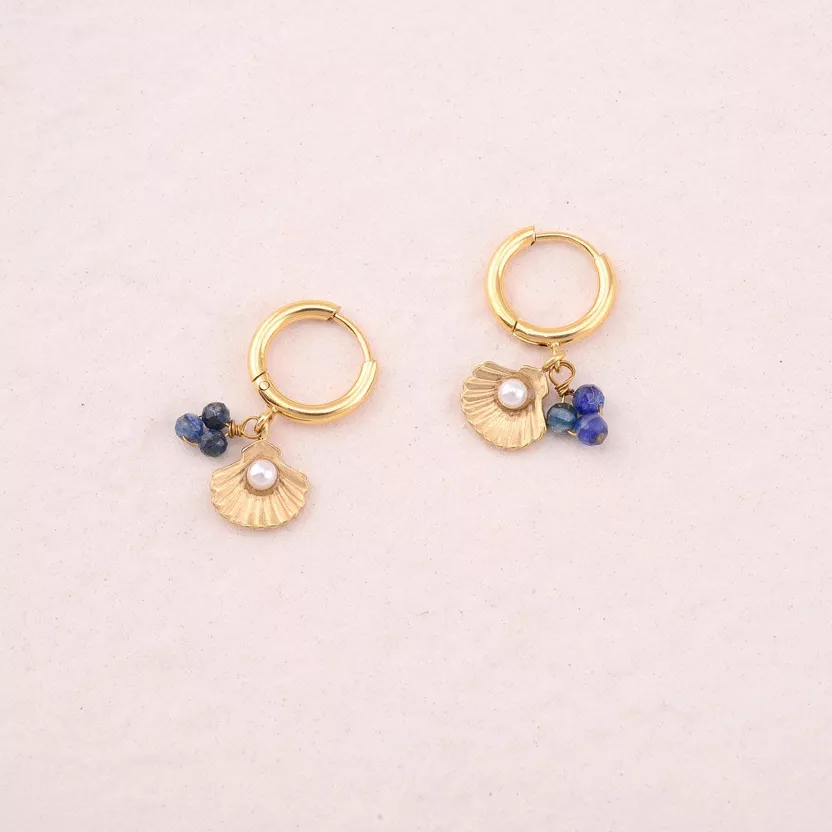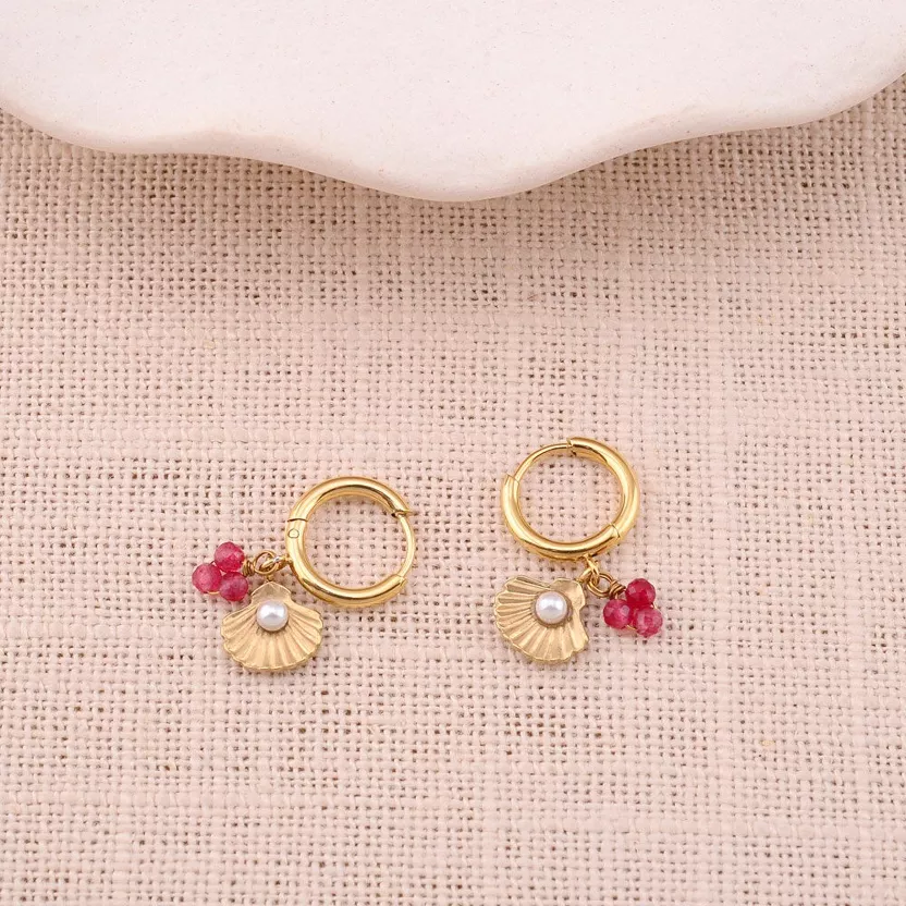 Boucles d'oreilles type créoles avec fermoir à charnière en acier inoxydable composées de pierres naturelles, d'un coquillage et d'une boule nacrée.