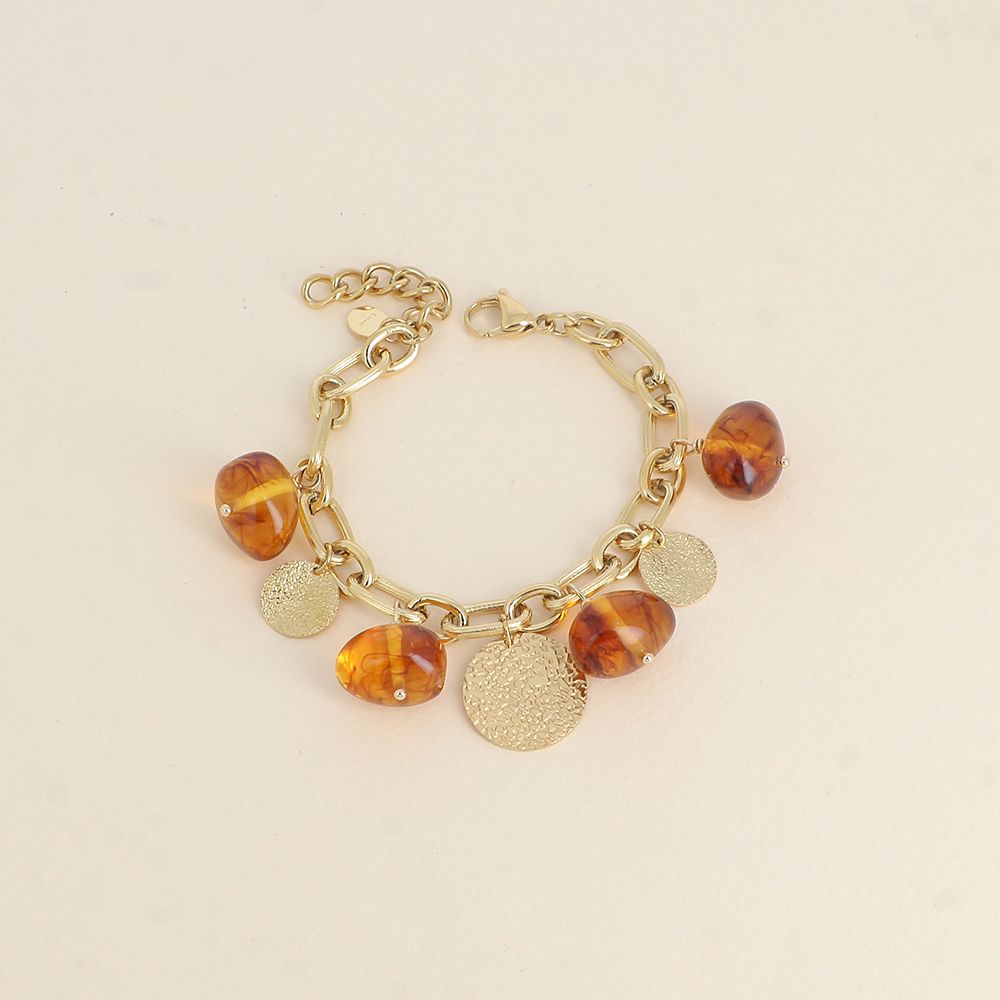 Bracelet sur chaîne en acier inoxydable composé de perles en résine et de pampilles rondes texturées.