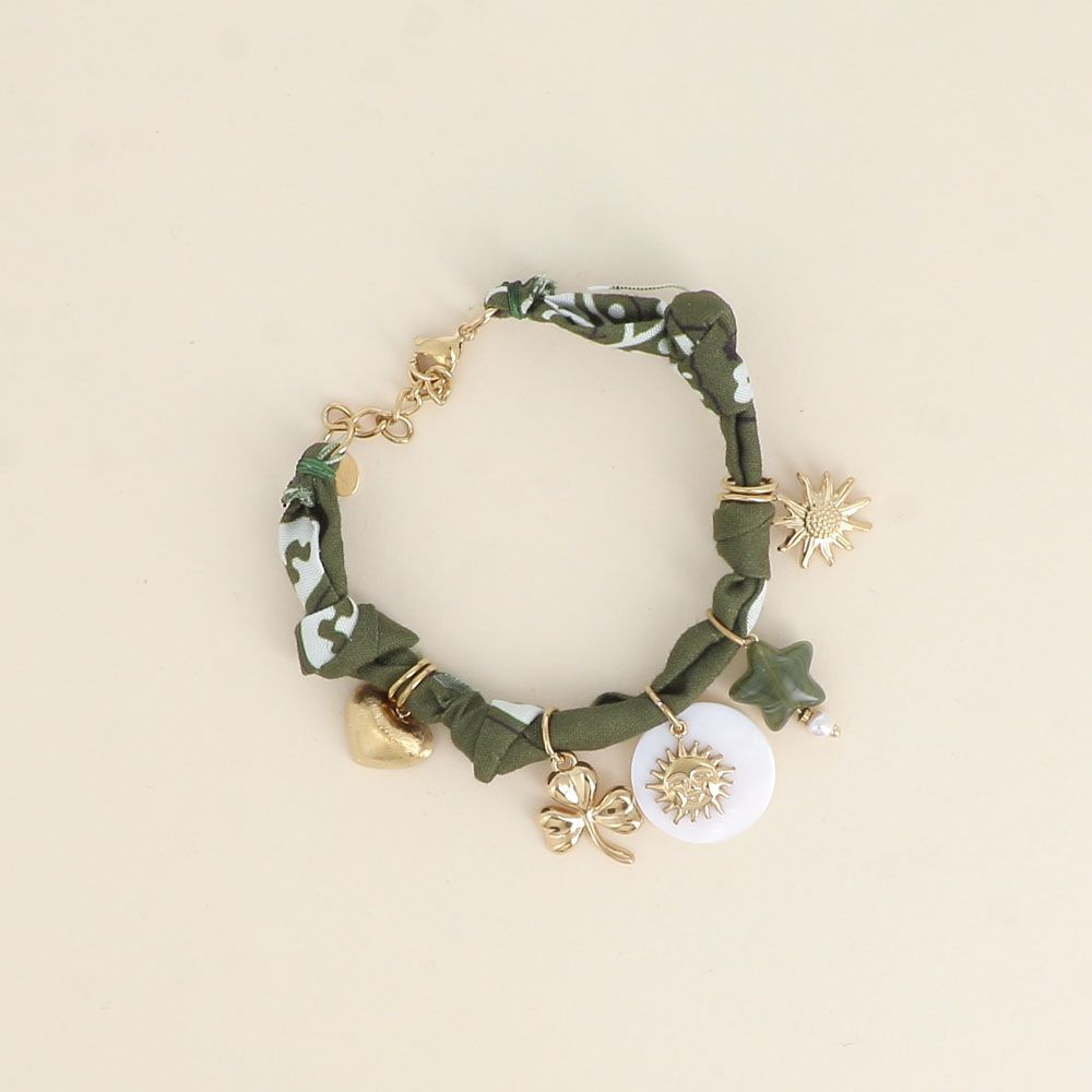 Bracelet composé d'un tissu aux motifs uniques, tressé avec une chaîne en acier inoxydable et embelli par des breloques (coeur brossé, trèfle, soleil, étoile en résine, fleur).