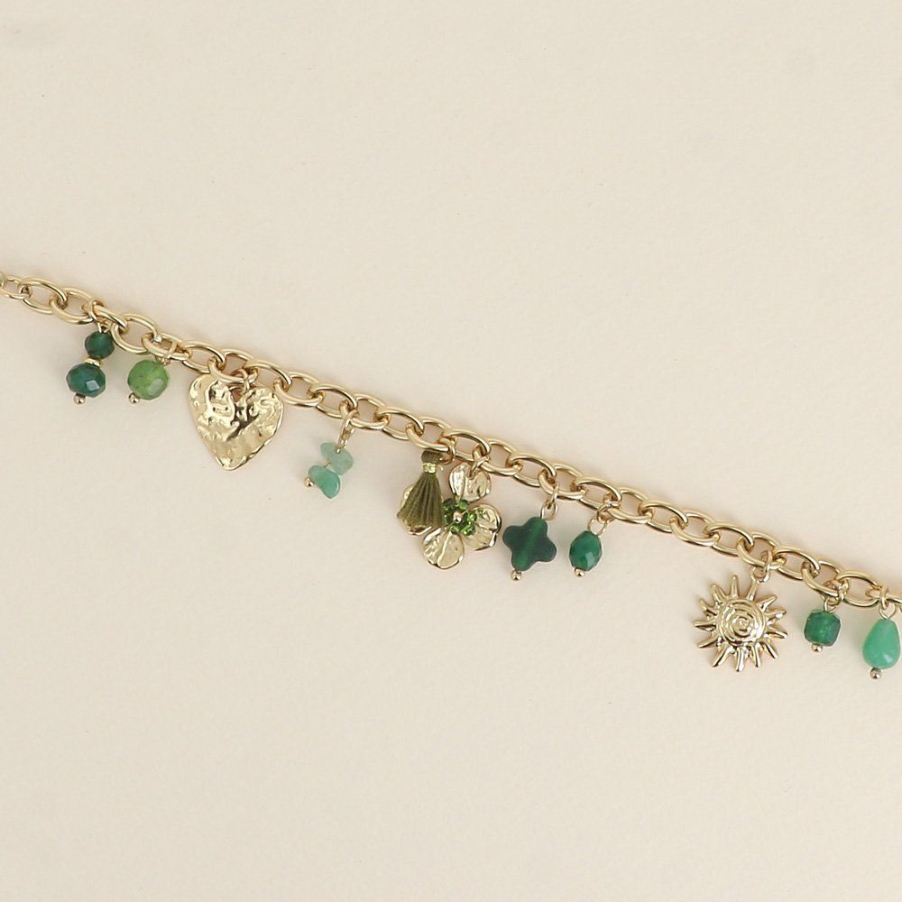 Bracelet sur chaîne en acier inoxydable composé de divers pendentifs (pierres naturelles, coeur, trèfle, soleil, pompon).