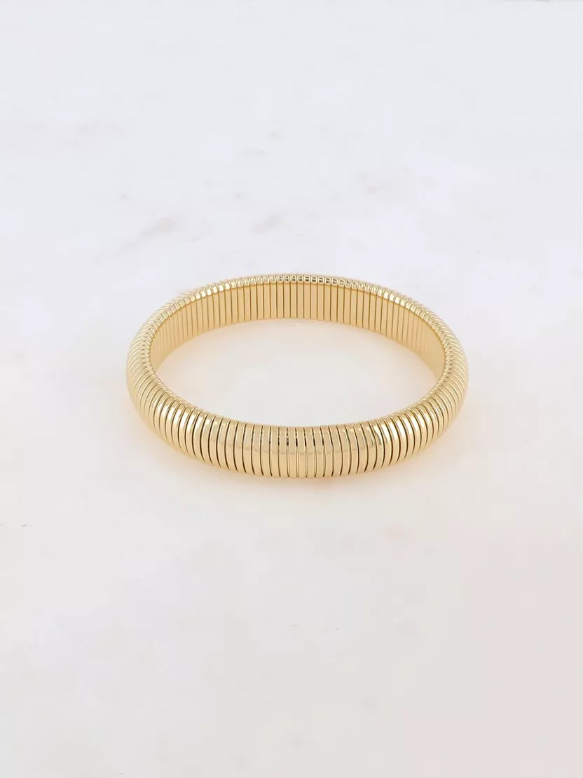 Bracelet graphique type jonc non réglable effet accordéon.Matière : Acier inoxydable.Hypoallergénique, ce bijou résiste à l'eau et ne noircit pas.Epaisseur : 12 mm. Diamètre constaté : 6,2 cm.