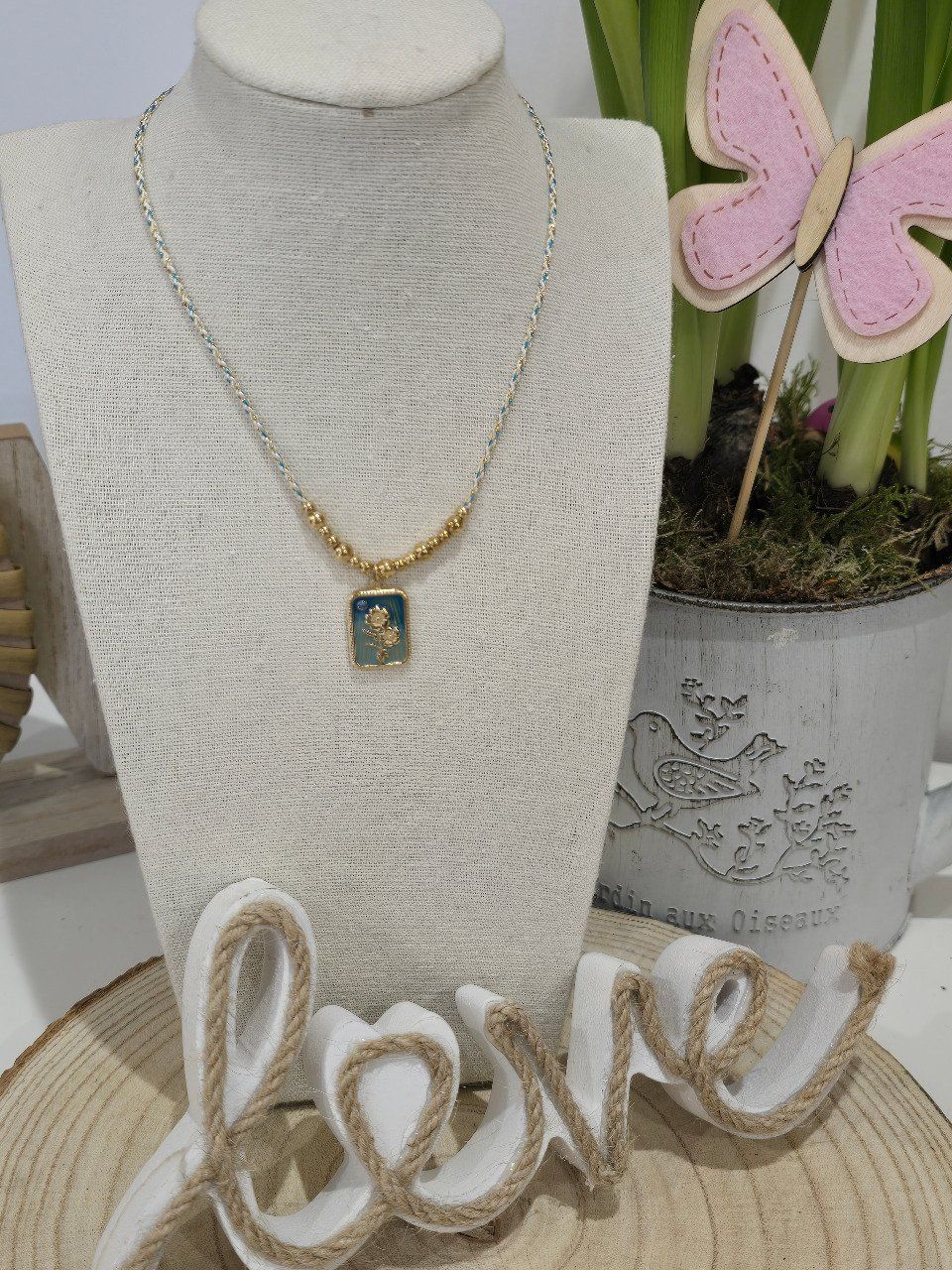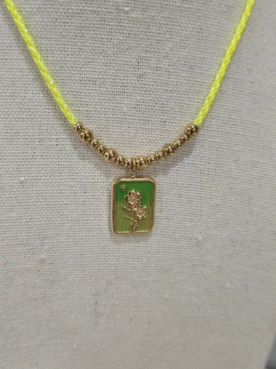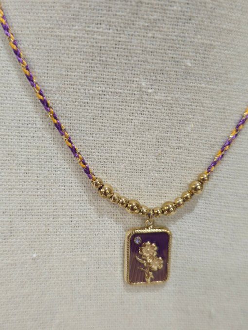 Collier sur cordon tressé coloré composé de boules en acier inoxydable et d'une pampille rectangulaire émaillée et strassée avec motif fleur. Fermoir mousqueton et chaînette réglable.