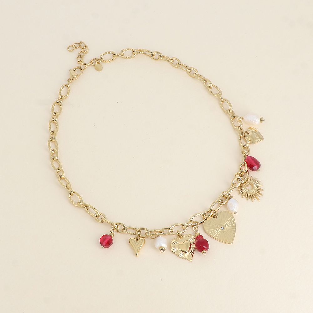 Collier sur chaîne en acier inoxydable composé de breloques coeurs, de perles et de perles d'eau douce.