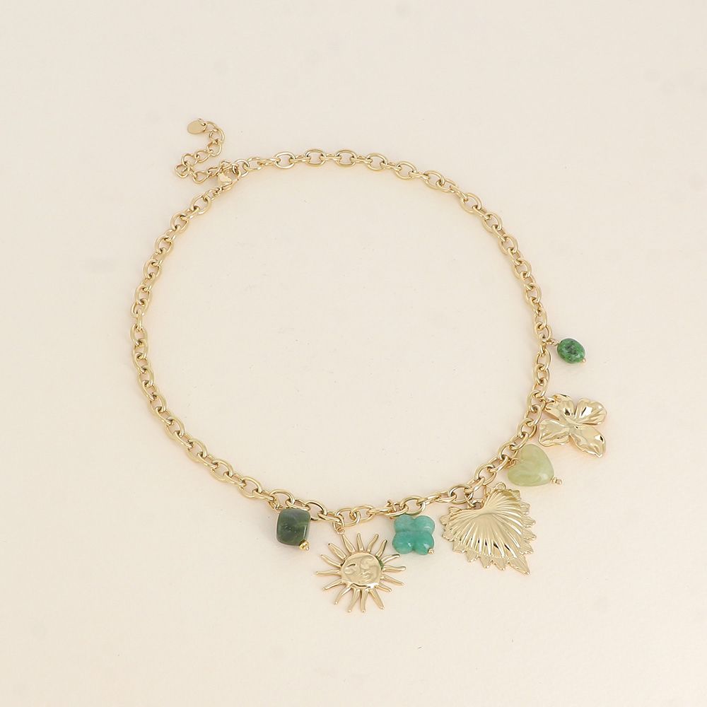 Collier sur chaîne en acier inoxydable composé de breloques (soleil, coeur, résine et pierres naturelles).