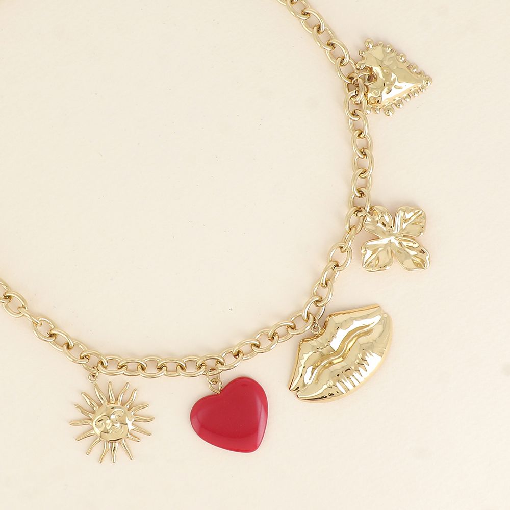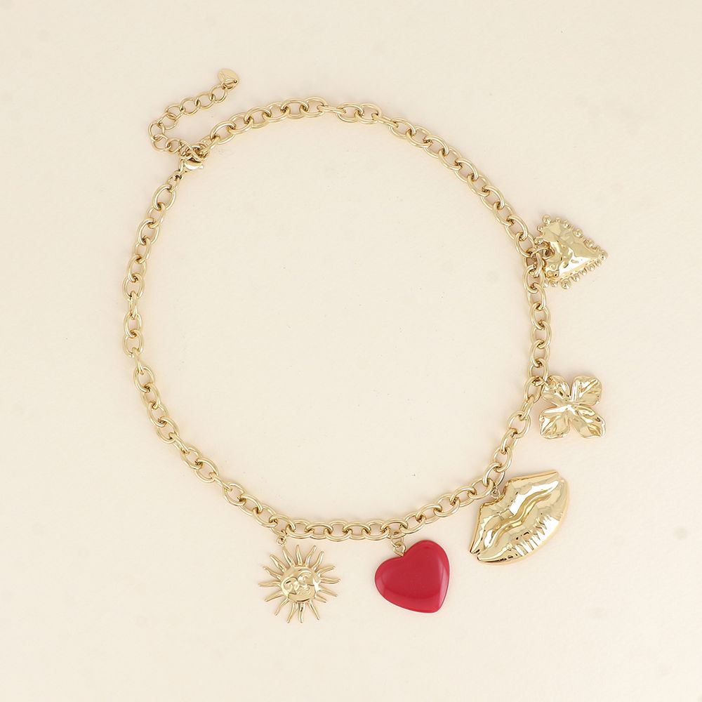 Collier sur chaîne en acier inoxydable composé de divers pendentifs (soleil, trèfle, coeur en résine, bouche et coeur texturé).