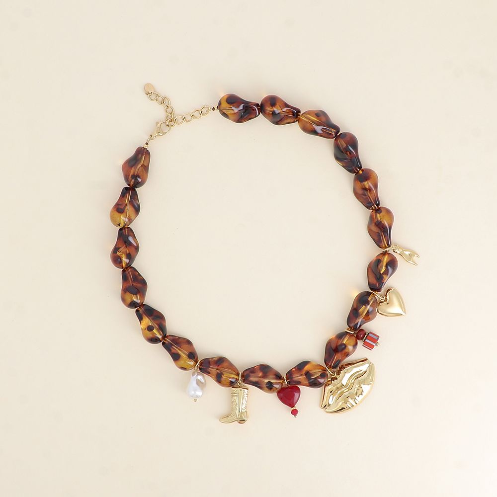 Collier sur fil composé de perles en résine et de pampilles en acier inoxydable (botte, perle coeur, bouche, céramique émaillée, coeur, main et goutte en résine).