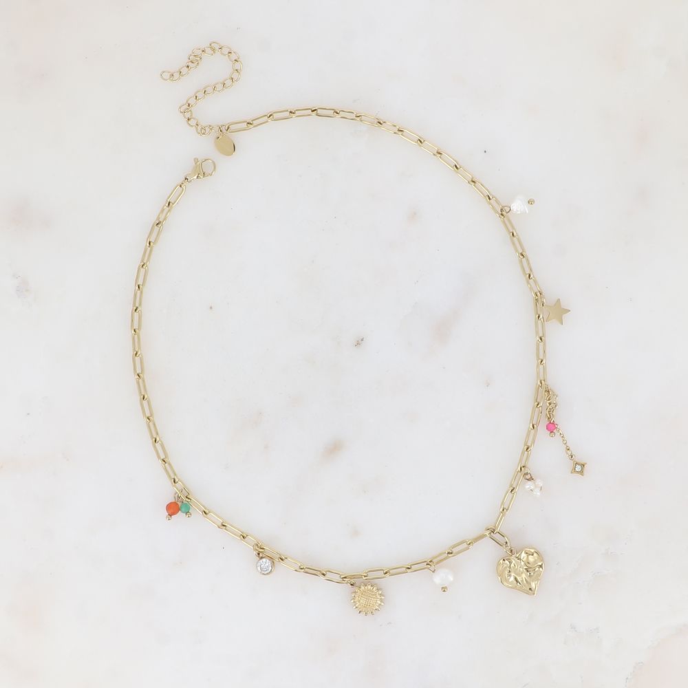 Collier sur chaîne en acier inoxydable composé d'une maille aux anneaux ovales allongés, embellie par des breloques diverses (coeur, fleur, étoiles, perles d'eau douce, pâtes de verre et cristaux).