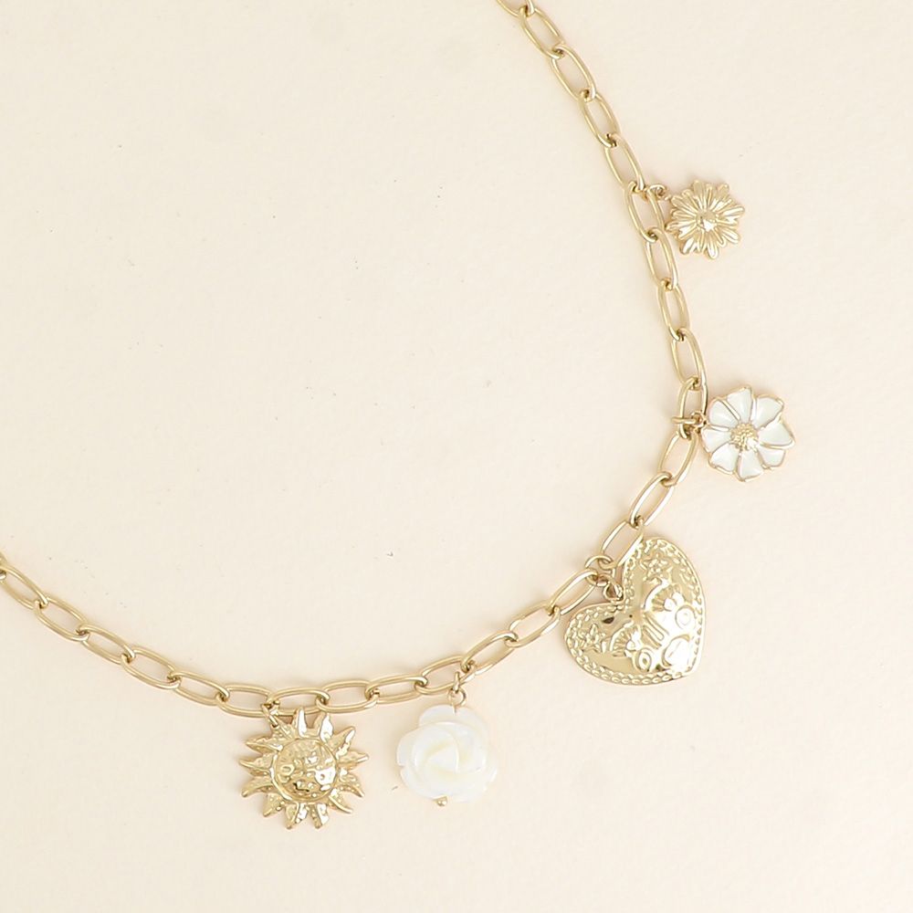 Collier sur chaîne en acier inoxydable composé de divers pendentifs (fleurs, soleil, coeur).