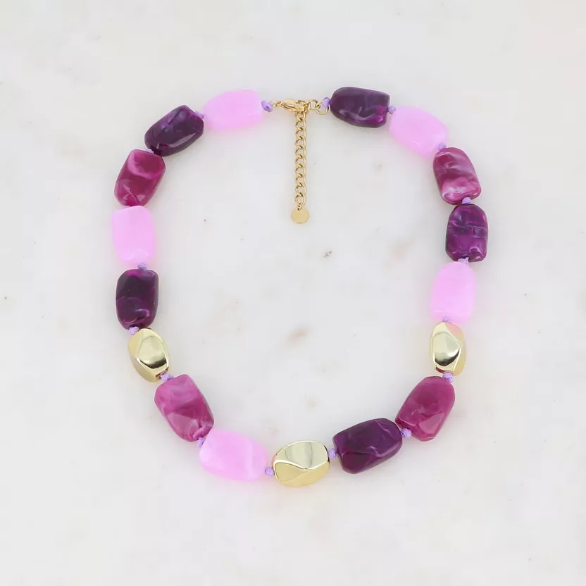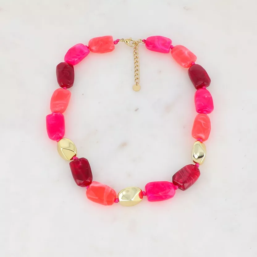 Collier sur chaîne avec perles en métal et en résine colorée. Fermoir mousqueton et chaînette réglable.