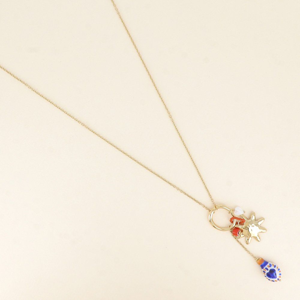 Collier type sautoir en acier inoxydable composé de divers pendentifs (soleil, perle en céramique en émail, perle coeur nacrée et perles).