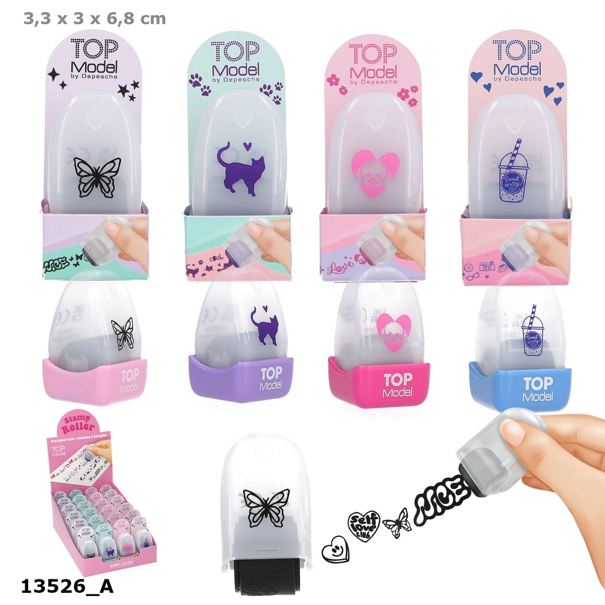 Ça roule ! Les tampons à rouler de TOPModel sont disponibles en quatre couleurs avec différents slogans et motifs. Noir avec NICE, des coeurs et des papillons ; violet avec HAPPY et de petits chats ; bleu avec de superbes symboles tendance ; rose vif avec LOVE et de petits chiens. À rouler sur du papi papier pour créer des décorations. Pas besoin de tampon encreur, l'encre est intégrée dans les rouleaux.